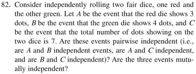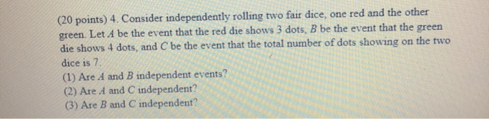 Let A be the event that the red die gets a 3 B be the event that the green die gets a 4 and C be the event that the total number showing on the two dice is 7. 3 dots B be the event that the green die shows 4 dots and. Consider independently rolling two fair dice one red and the othergreen.