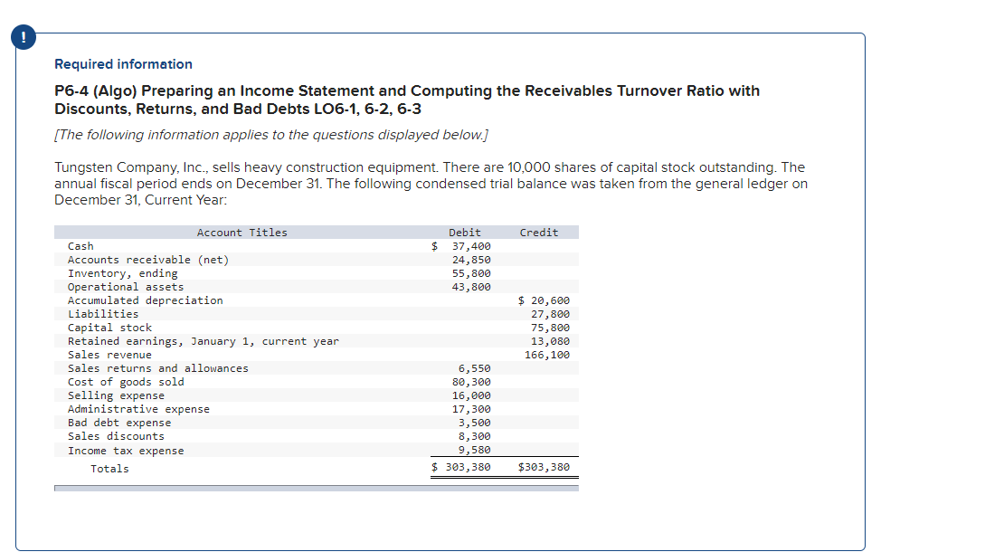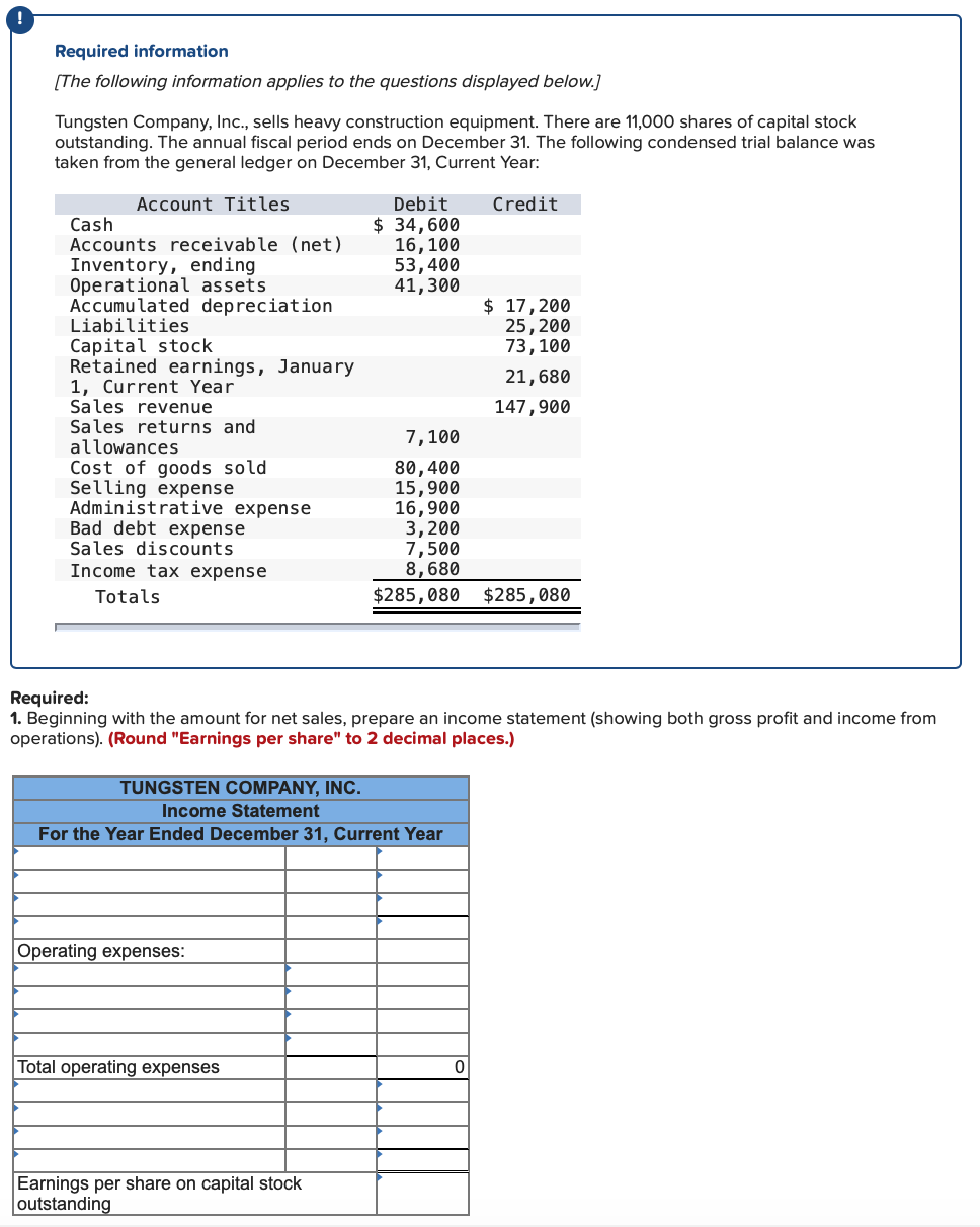 Debit 37200 24300 55600 43600 Account Titles Credit Cash Accounts receivable net. Tungsten Company Inc sells heavy construction equipment. 1 Answer to Tungsten Company Inc sells heavy construction equipment There are 14500 shares of capital stock outstanding The annual fiscal period ends on December 31 The following condensed trial balance was taken from the general ledger on December 31 Current Year.
